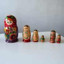 Sex ryska dockor, matrjoskjas, ur tre olika serier. De är flera, men ändå en. Träsnidade och handmålade i olika mönster och färger. Varierande ålder och skick, uppskattningsvis yngsta från 1990/2000-tal och äldsta från 1950-tal. Den största mäter 22 cm, och den minsta är 5 cm hög.